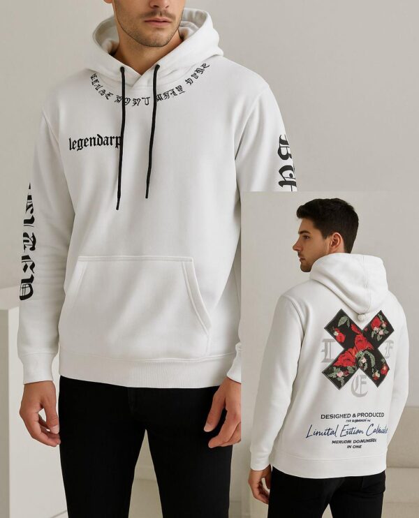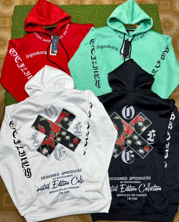 Elevate your streetwear with the Limited Edition Collection by Boohooman. Available in Red, Aqua Green, Black, and White, these hoodies feature bold, vertical script detailing on the sleeves and front. The back showcases a striking, cross-shaped floral graphic with deep red roses. This exclusive piece is designed and produced by Boohooman, promising a unique and statement-making addition to your wardrobe.